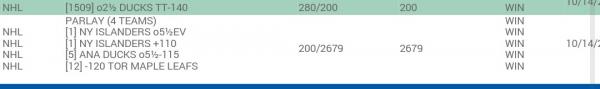 #9Last night went with the over in the ducks and islanders along with Toronto and the islander is a 4 team parley. Which turned out extremely well. Even though we had to sweat out the Toronto game. But all for winners puts us at