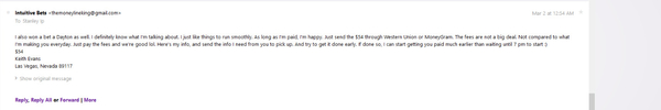 This service is operated by Keith Evans from Las Vegas. His website is: themoneylineking.wix.com/intuitivebets. His ads are all over Craigslist. He claims to have a 90% win rate and he manages your account. When he wins, you pay him 30% of the winnings. After that, he makes you LOSE EVERYTHING. I lost about $500 in a couple of days with his service. STAY AWAY FROM HIS SERVICE! He's nothing but a SCAM ARTIST. If you see his ads on Craigslist, please flag them. I've filed complaints about his service on Ripoff Report and on Complaints Board.