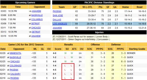 #786You have to go to the daily board, that is what I use. They were a dog on the 21st and lost by 1. I can't help if they are improperly listed on the team's yearly log sheet. Go to Feb 21st games and look up final lines for L.A. Kings. They were -105 and they lost by 1 (This is a +1 1/2 play in my system). You will obviously see that the game you circled is an error. Why don't you guys just let me handle the plays, no offense, but looking for errors seems to be everyone's daily past time lately.Originally posted by dominate.Well, in my defense, when I asked about the LA Kings being a play the other day, I thought I saw them as losing 3 SU and 3 ATS on scoresandodds (which I thought you went by). So, I went back and checked about 30 seconds ago and it turns out I wasn't hallucinating. I just wanted clarification on that Phoenix game to see if you were considering it a win or a loss since scoresandodds considered it a loss. Haven't checked the other games that people are asking about, but maybe they have a reason, too. :/