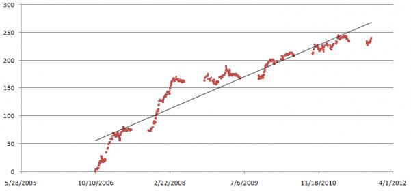 Looking for thoughts on how to evaluate a system like this. Do you care more about the betting over the last two years, or does the 2006 and 2007 season seem like it might repeat at one point? Would you look for subsets of this data that show a higher return per unit bet, even if it means making less total money in the long run? I think everyone's looked at a chart like this at some point and wondered the same thing.