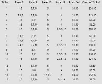 #8Originally posted by BGboothATaking a big shot here at the $750,000 guarenteed late pick 4 at Saratoga today. I split this 'ticket' with a buddy threw in some value hoping to hit something big. Tickets total $208.