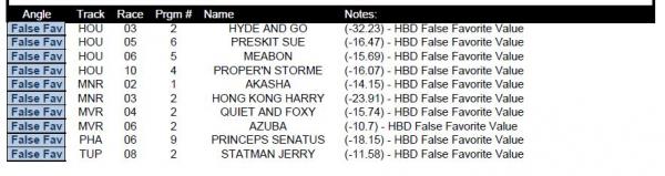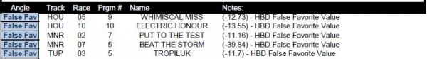 #24As always I am constantly trying to find new angles and new ideas. Looking at this false favorite report I have begun to look at connected races that make the report. For instance today DED05, DED06 and DED07 all make the list. If I believe in these numbers (and I do) that would say to me that there is added value likely in the horizontal bets that tie these races together. In this case, the rolling DD and the race 05 pick3.