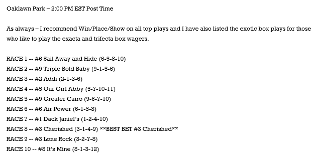 Race Three: The (5) Valiant Appeal is my top choice here. First I love Danny Pish and Lane Luzzi together, and second, this horse is dropping in class pretty significantly here after a second place finish at the higher level, and scoring a win two back. Also using (2) and (7).