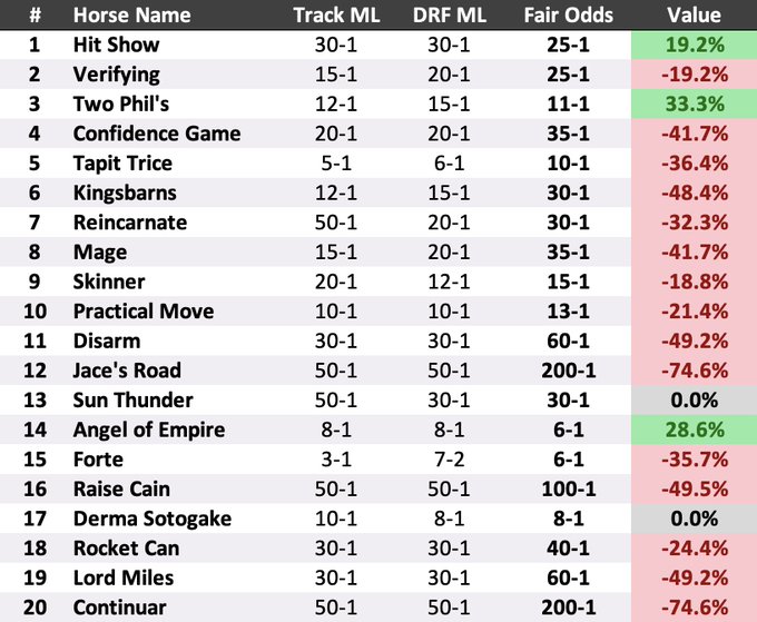 NYRA Money Line Maker Opinion on Fair odds for the KY Derby