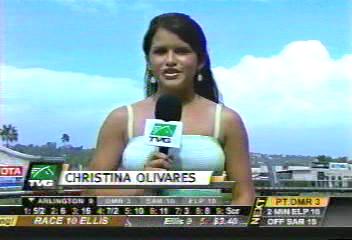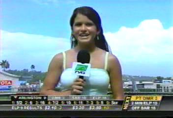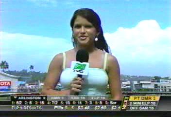 This reporter was born to cover the races at Del Mar. Love the outfit. There are no images of her on google except for her small photo on the TVG web site. Made some caps of her appearance at Del Mar on Sunday.
