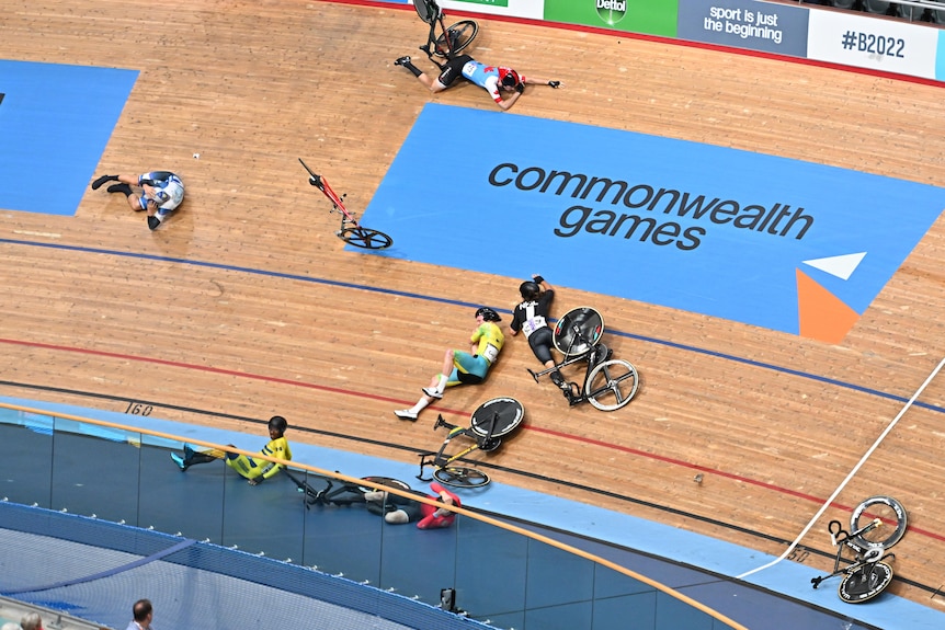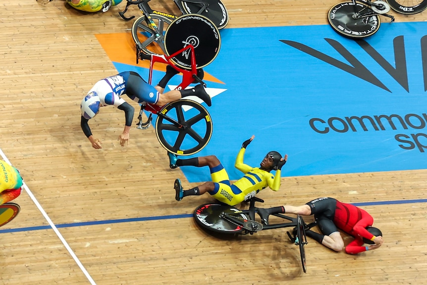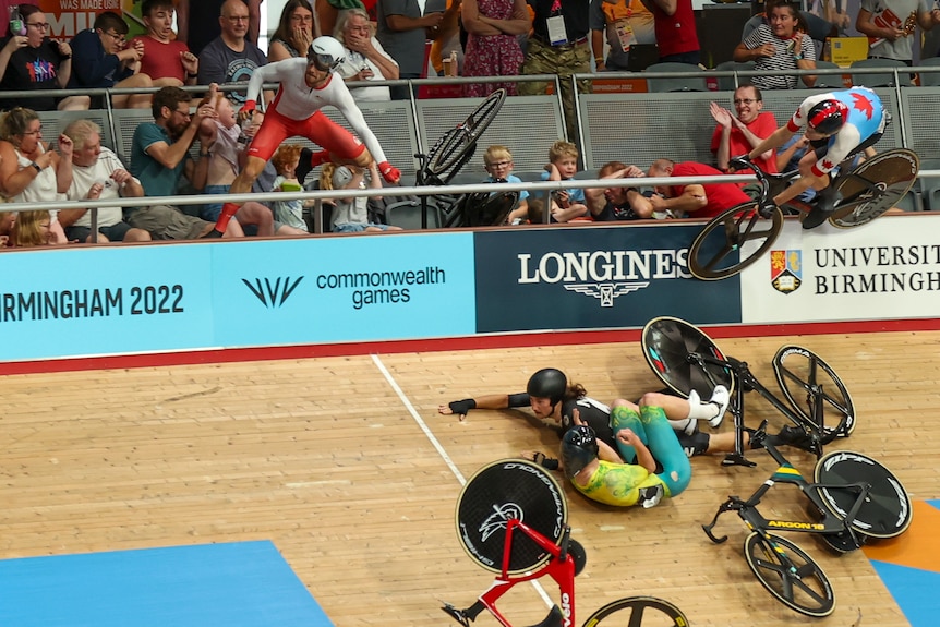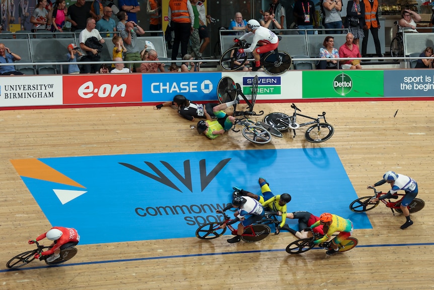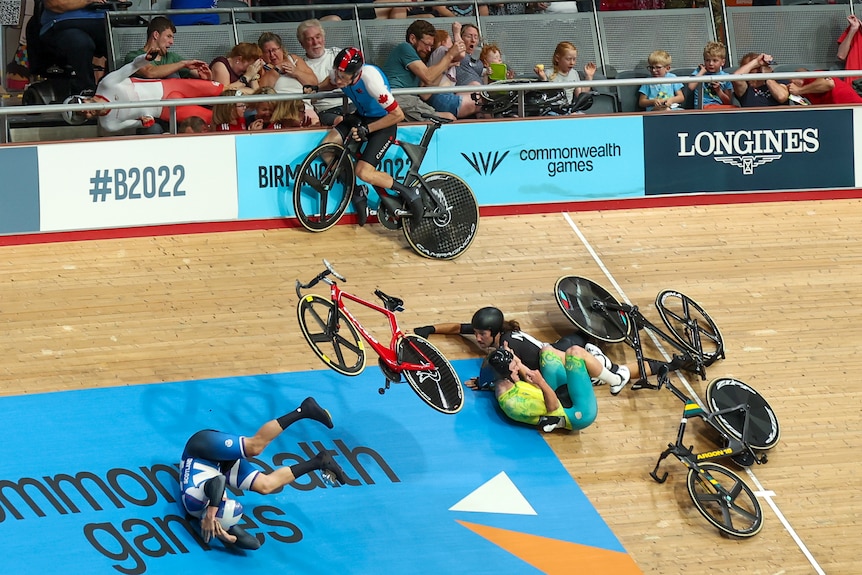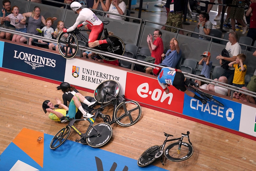 Three cyclists have been taken to hospital and spectators have been injured following a horrific crash during a heat of the men's scratch race at the Birmingham Commonwealth Games.
