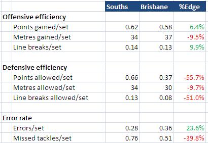 Take this with a grain of salt - it's only week 3 and they are not adjusted for the toughness of schedule. I also haven't yet got all the stats to baseline them against the rest of the comp - the % edge listed here is just in terms of the average of both teams on a given category. Never-the-less they show that both teams are evenly matched offensively but with a clear edge to Brisbane on defense. If the stats had a bigger sample size then this would have me lean towards the under on the Souths team total and/or the Brisbane team total over.Souths Brisbane %Edge Offensive efficiency Points gained/set 0.62 0.58 6.4% Metres gained/set 34 37 -9.5% Line breaks/set 0.14 0.13 9.9% Defensive efficiency Points allowed/set 0.66 0.37 -55.7% Metres allowed/set 34 30 -9.7% Line breaks allowed/set 0.13 0.08 -51.0% Error rate Errors/set 0.28 0.36 23.6% Missed tackles/set 0.76 0.51 -39.8%