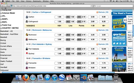 #5Sportsbet are offering money back if you back the loser in the Carlton v Collingwood match if they lose by 13 points, so effectively its Carlton +13 @ 1.91. I am getting on it asap.Comment -