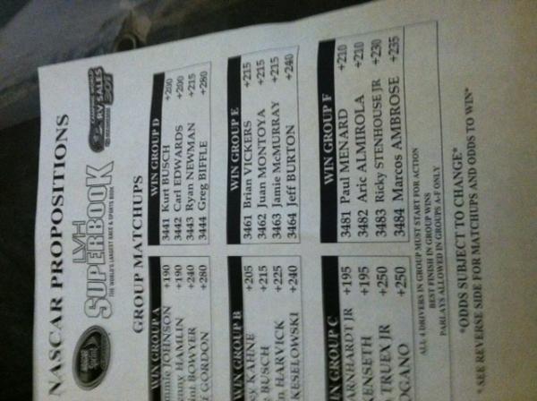 #88Shit buddy ur guess as good as mine. I never had any Luck with them. But if I was gonna parlay 2 of them guess I'd go with Logano in group C and vickers in group E. not sure either is a great play but there it is. There's always 2 u think u can beat and 2 that are so damn close its a coin flip for every group.