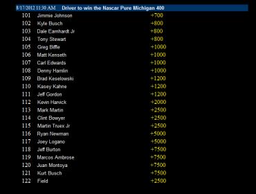 #62always by tuesday morning he will post them there, every week...only LVH linesOriginally posted by onlookerMike. It's useful for me. The only way I see LVH odds, is if I drive over there. If I can see opening odds there every week, it would help. So I can compare to WillHill LV, Stations and Coast. LVH usually has better odds then most places in the valley for everything else, so it will be good to see how they stack up in NASCAR.