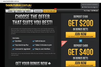#8427Guys just to clarify the issues that some are having with Bookmaker, If you are from selected states SA, VIC etc, the website picks up your IP address and the home page automatically only shows a $100 free bet. I had to go through google by searching "bookmaker bonus bet" the very first search result redirects you to a page where you can get up to $400 using the code BMCODE400. Hope this helps