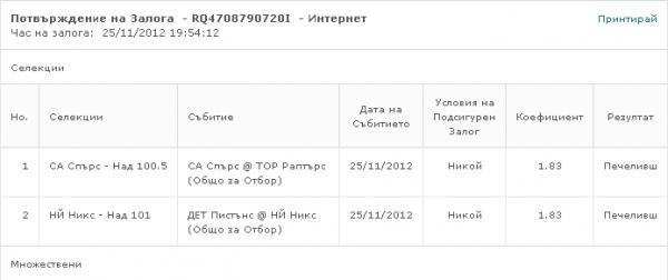 #53Да, но все пак по-добре печалба, отколкото да се бяхме набутали на -6 спред, който щеше да загуби. Предпочитам печалба на малък коефициент, отколкото загуба. На мен това ми е целта - максимално висок процент познати, а коефициентите не ме интересуват толкова. Между другото тия дни се заиграх с опциите на бет 365 да си правиш сам линии (това, на което американците му викат тийзър) и резултатите са доста добри. За последните три дена съм 7-0, ако ги бях пускал поотделно. Ето от вчера и оня ден