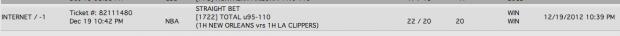 Aw man, were you watching the game? Hornets are bound to start hitting threes (espeacially Anderson and Vasquez). They went 0-7 from beyond the arc until Vasquez finally hit a 4 point play to end the half. Anyway, I think the over would have been a better bet, but all I care about is Hornets covering +14 lol