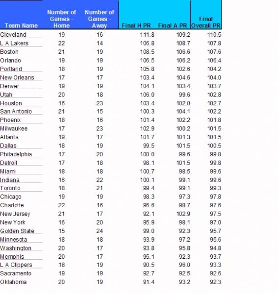 This is the output from the NBA Excel spreadsheet. I will try to figure out as how to start a new thread and post the power ratings everyday with an explanation as how to use it. Also Ill try to put the spreadsheet up for download. I really dont want to spend too much time managing it. The column you would be interested in is the "Final Overall Pr" Last column. Just take the teams playing and subtract their power ratings. Make sure there is a 2 to 2 1/2 point overlay for the play. Yesterday it went 4-0, check it out the power ratings did not change from last night. Tonight for example take DET 99.8 and round up to 100 - CHA 97.5 = DET -2.5. Now subtract the line of -7, CHA is a + 4.5. The game is outside the 2 point overlay so the play is on CHA. There are some other rules as well which I will explain in the thread.