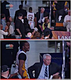 (photo 1) Dwight brushes past Kupchak.. forcing to hunch and move out of the way.. to embarrassingly avoid contact.