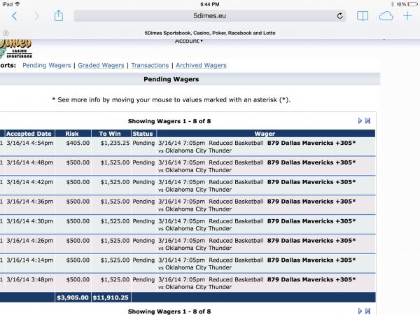 Im not doubting you, I was on Mavs on the spread...I was just asking you were able to make multiple bets of the same game game, most books have limits on stuff like that