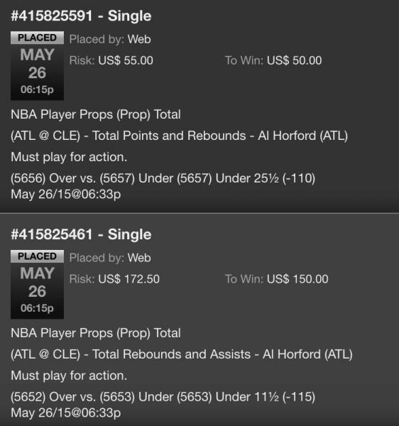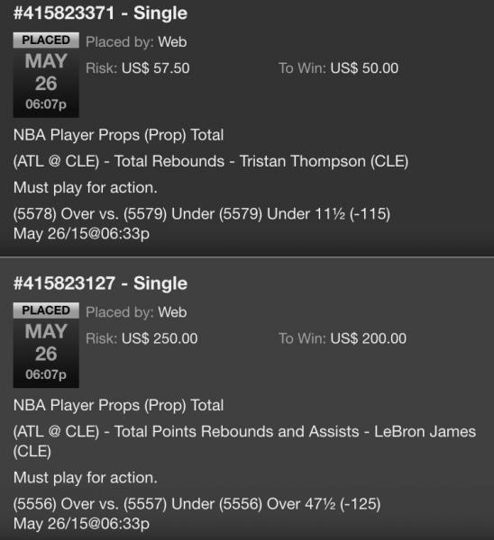 (5111) Over 8½ (-110) May 25/15@07:03pWeb US$ 55.00 US$ 50.00 May 25, 2015 06:40:50 PM Single #415676363