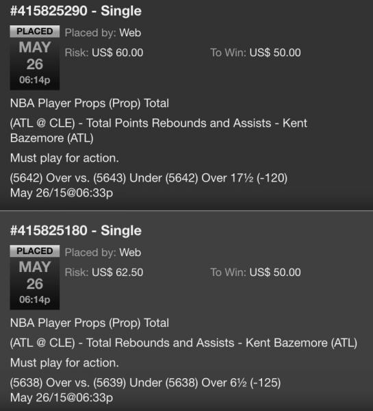 (5093) Over 20½ (-125) May 25/15@07:03pWeb US$ 125.00 US$ 100.00 May 25, 2015 06:38:52 PM Single #415675957