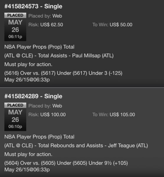 (7125) Under 28½ (-115) May 24/15@06:33pWeb US$ 57.50 US$ 50.00 May 24, 2015 06:04:36 PM Single #415506864