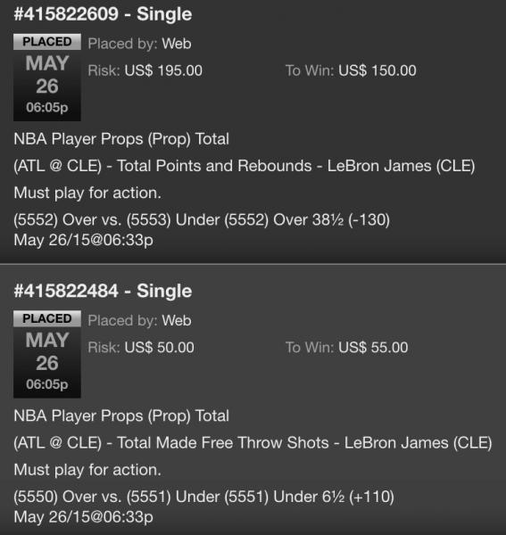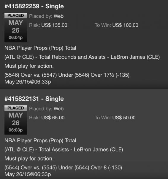 (5110) Under ½ (+105) May 25/15@07:03pWeb US$ 150.00 US$ 157.50 May 25, 2015 06:40:13 PM Single #415676216