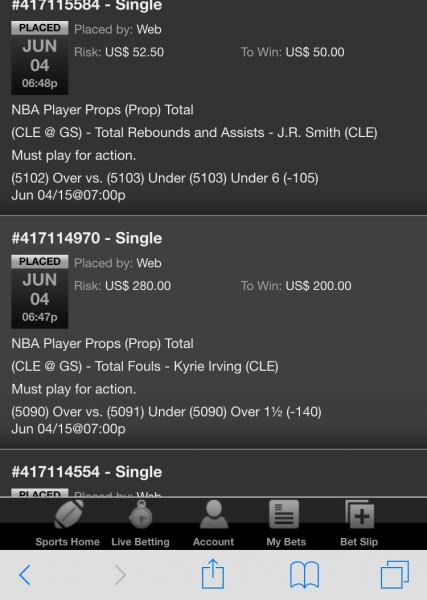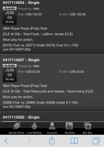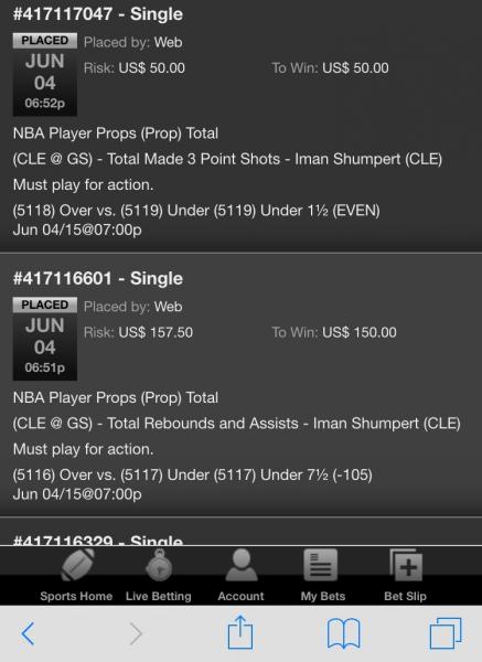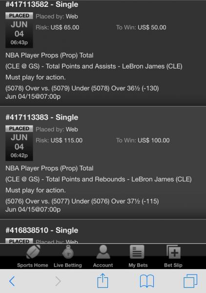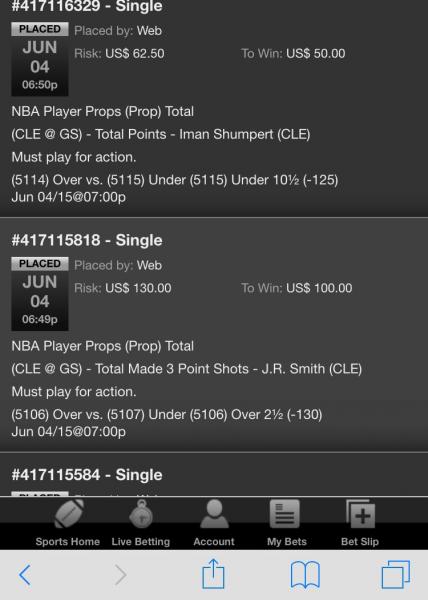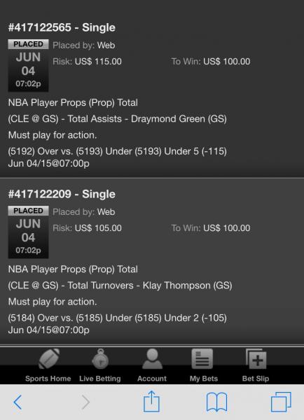 (6577) Under 10½ (-115) Jun 09/15@07:03pWeb US$ 57.50 US$ 50.00 Jun 09, 2015 06:21:59 PM Single #417909466