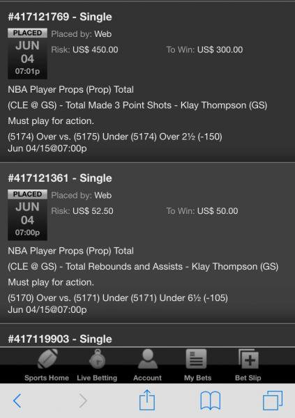 (6569) Under 2½ (-105) Jun 09/15@07:03pWeb US$ 105.00 US$ 100.00 Jun 09, 2015 06:20:38 PM Single #417909145