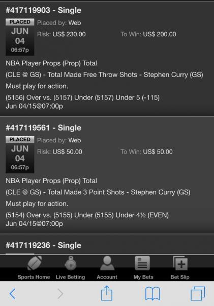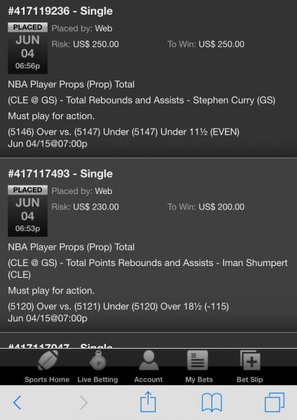 (6613) Under 11½ (-115) Jun 09/15@07:03pWeb US$ 230.00 US$ 200.00 Jun 09, 2015 06:28:05 PM Single #417911012