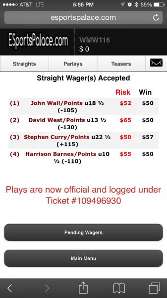 | (1) | John Wall/Points u17 ½ (+100) | $200 | $200 |