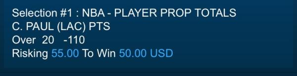 C. PAUL (LAC) PTS+ASSTSOver 34½ -130 Risking 260 To Win 200 USD NBA - PLAYER PROP TOTALS
