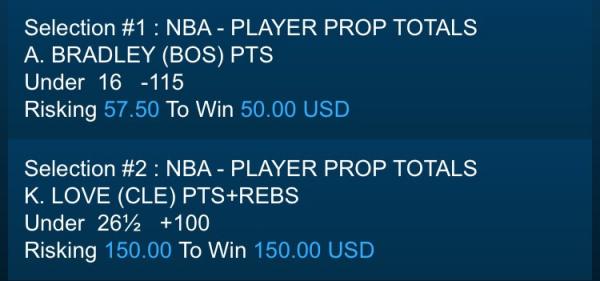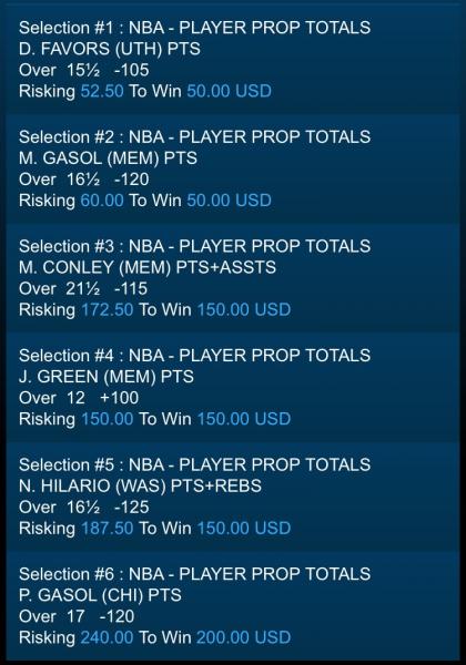 #2122/26/2015 8:00:00 PM Future/Prop S. CURRY (GS) PTS+REBS+ASSTS NBA - PLAYER PROP TOTALS . . Under 37.5 +115 2/26/15 7:54 PM 2/26/2015 8:00:00 PM Future/Prop S. CURRY (GS) 3 POINTERS NBA - PLAYER PROP TOTALS . . Under 3.5 -145 2/26/15 7:54 PM 2/26/2015 8:00:00 PM Future/Prop D. GREEN (GS) PTS+REBS+ASSTS NBA - PLAYER PROP TOTALS . . Under 21.5 +105 2/26/15 7:54 PM 2/26/2015 8:00:00 PM Future/Prop K. LOVE (CLE) PTS NBA - PLAYER PROP TOTALS . . Under 17.5 -110 2/26/15 7:54 PM 2/26/2015 8:00:00 PM Future/Prop K. LOVE (CLE) REBS NBA - PLAYER PROP TOTALS . . Under 11.5 -120 2/26/15 7:54 PM Comment -