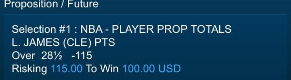 L. JAMES (CLE) PTS+RBSUnder 33½ +100 Risking 100 To Win 100 USD NBA - PLAYER PROP TOTALS