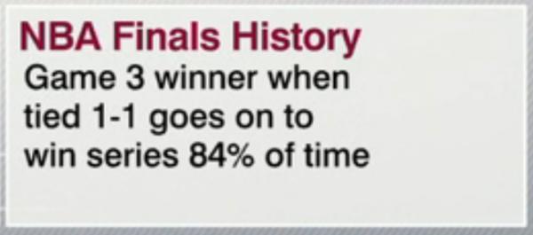 NBA Finals: when tied 1-1, Game 3 winner takes series (84%)