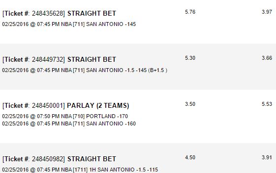 #12Originally posted by Lee JonesHaha yep ez money. Their totals have been inflated the past couple of days. Kings team total under 103.5 vs them last nighte was pretty simple also. Goodluck on the spread, I couldn't pull the trigger on it.i have portland and spurs ML in parlays. I have both of them left for 2 parlays worth 60/376. I hedged on both at half just in case. now i hope houston comes back and loses by like 8-10. That would be perfect.Originally posted by Lee JonesHappily took portland -4 tonight. Going strong so far. Spurs prob win here by 2 or something dumb lol