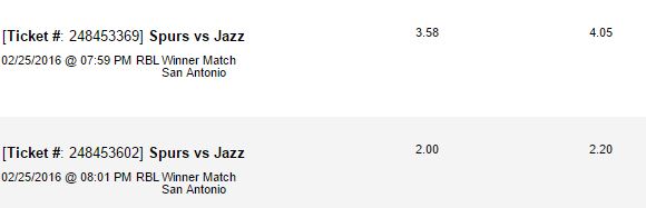 Spurs ML baby!! I have those parlays and i have a straight bet on the ML 73/50.. i went heavy on spurs. i think a lot of people would have taken utah because spurs coming off a B2B, but only 1 guy played over 30 min. they wont be tired. great defensive game so far.Originally posted by JCrack2015Nice to see you guys cashing on the under! I'm hoping I made myself a little more profit with a live bet on Spurs ML when they were down in 1H.