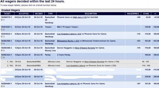 100.00 166.67 1.Win 29-OctBasketball/NBA (Money Line) Denver Nuggets vs New Orleans Hornets for Game (-120) 95 - 101 2.29-Oct-10Basketball/NBA (Money Line) Los Angeles Lakers vs Phoenix Suns for Game (-220) Pending
