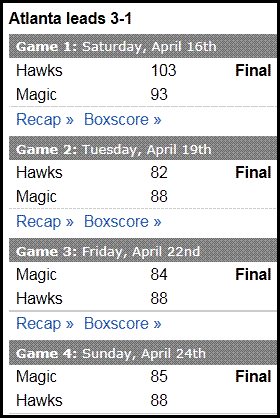 Atlanta +7.5, the magics will continue with shooting slump, heavily depend on mid rang jumper & low post while the Hawks still can put a decent shooting between Johnson and Crawford.