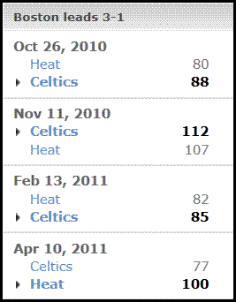 A physical game is lining up for the opening, aggressive transitions & attacking the rim will be a major part of the heats' game plan, Boston had successful in taming James in the past by gotten him taking jump-shots instead(Orlando too had done exactly the same while en-routed to the final 2 years ago) of low post plays, set physical screen & wall him up to the rim. They would isolate Wade to the lane & trap him with offensive charge & foul, create a backfire with his low post attack & quickness. This leave another offensive task in Bosh to a one-one match up with KG to defense head up. As for their offense, Boston will look to Rondo attacks the lane & spacing out Allen, Pierce, KG and Green for open 3's & mid range jumpers.