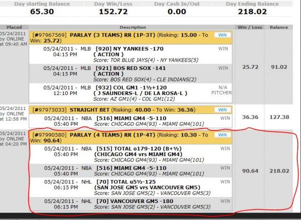 After getting crushed by BS bets (specifically OKC) I was down to $65. So I parlayed the bet shown below. Cant get much luckier than that. Miami goes into OT to take the -5 and the over, and Vancouver takes it into OT after a goal in the last 13 seconds to win it. I knows its not a lot, but I feel much better about getting lucky for once finally.