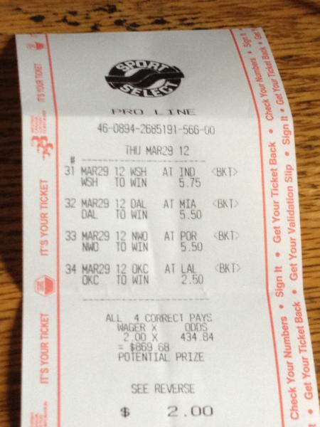 | PARLAY (4 TEAMS) [701] WIZARDS (WAS) +10½-110 [703] MAVERICKS (DAL) +8½-110 [705] HORNETS (NO) +8½-110 [707] THUNDER (OKC) -1-110 |