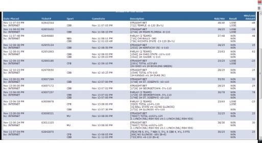bad. I also would like to advise you that though being from Chicago I like to bet the hometown team, I would not consider myself a hometown gambler but I will toss blindly toss a few bucks on the Blackhawks or Bears before a game. I'm not saying you have to stay away from these bets but if I post a blackhawks game but I will probably be betting on every hawks game just because it makes it a little more entertaining. When I do post my picks I like to give in depth reason why I like the game, so if you see a hawks bet ten minutes before game time and no research its probably just a fan bet, just wanted to give eveyone a heads up before so I don't have dudes at my throat because they put their kids tuition on the hawks last night. Like I said earlier I'm 20-2 on my last 22 bets. As you will see though when I post the pictures in a little I am no high roller. Being a college kid from Illinois my average bets range from 25-50 dollars. I know I'll probably take shit for not throwing more money on games but I'm in it for the long haul, plus why would I want to go out and get a job when I can make 5x the money from sitting on my ass in frony of a computer doing a little research for a few hours a day, ya know? I went a perfect 6 for 6 yesterday and have won my last 13 straight, it'd be nice if I had a sack and threw down some real money but we'll see what happens. Thats pretty much it folks, I'm here for the same reason you are and thats to make some free cheese. I don't mind answering questions after I post my picks and if you have any insight on a game I'd like you to give me a heads up. I like an active comment section, gives me something to do. On that note folks good luck to everyone and lets make some dough.