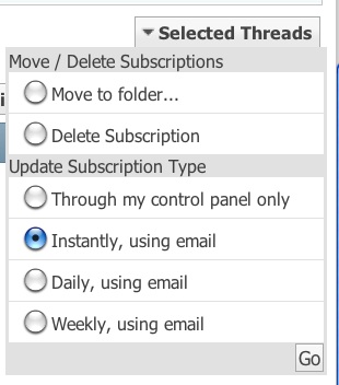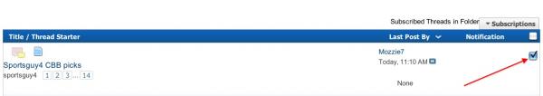 #466Originally posted by Melted IceSportsGuy, I missed out on last night's play because I thought you were not going to post one. I did not check my phone while working last night. Is there anyway to be alerted when a posters posts something- either via text or email? ThanksYou have to enable the setting to get email updates. After subscribing to thread, navigate to your subscription folder (through settings). Under "Notifications" (right side of page) select box for each thread you want email alerts. Bottom right click on "Selected Threads". Under "Update Subscription Type" choose "Instantly, using email" and click go.Originally posted by Mozzie7Under 'Thread Tools' at the top of the page, click subscribe to this thread and it will email you anytime someone posts something...
