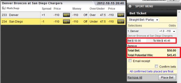 The example was place on Denver winning, as they are placed as the underdog in the bets.. I think.