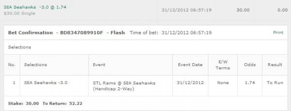 1. STL Rams @ SEA Seahawks -3 (7-3) @ 1.74 $30 13-20 +$22.23