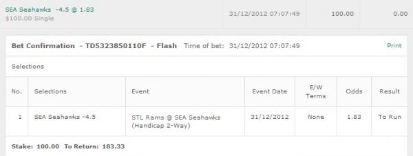 2. STL Rams @ SEA Seahawks -4.5 (7-6) @ 1.83 $100 13-20 +$183.34