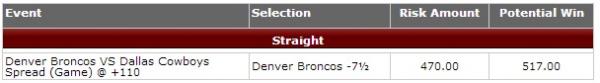 #4Dallas will play very well here and might win straight up. Look at who Denver has beaten so far. Line is way off should be denver -3.5 will gladly take the Touchdown at home with the Cowboys they will keep this a 1 score game into the 4th quarter.Comment -