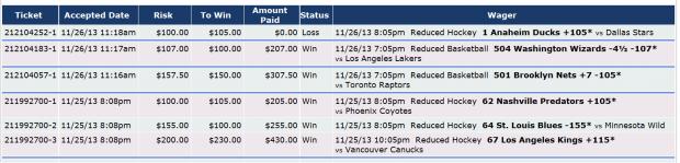 | 212321776-1 | 11/27/13 12:56pm | $137.00 | $100.00 | Pending | 11/27/13 7:05pm Reduced Hockey 54 Washington Capitals -137* <small>vs</small> Ottawa Senators | |