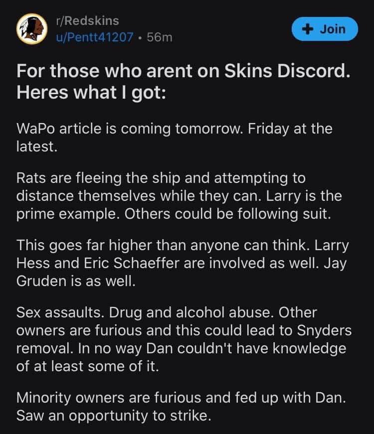 For those of you just getting up, Dan Snyder, the Redskins’ coach is evidently in some trouble for parties past and the WaPo is gonna out him today.