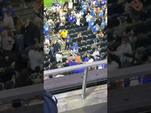 Everything was all talk until somebody (appears to be a women) a couple of rows back threw something at #99 when he had his back turned to talk to the stadium worker.Comment -
