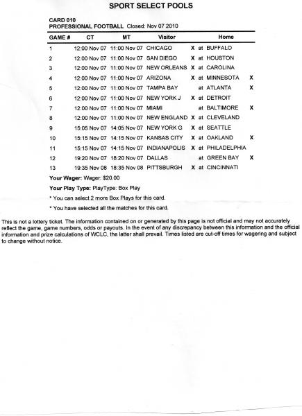 $5 for straight pick or they can box up to 4 games $10-20-40-80 meaning you can pick both teams for a natural win (SEE FILE) the total pool was $ 138,430.50 @ $4465.50-EACH (ps. the file pic is my summary yes i did lose.)