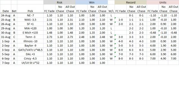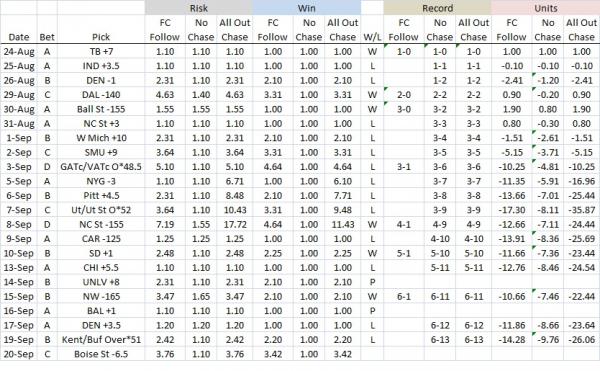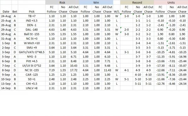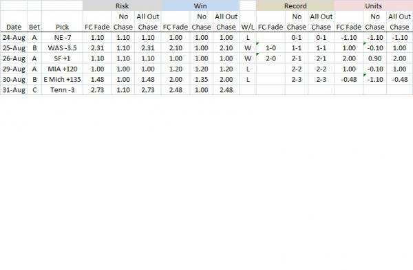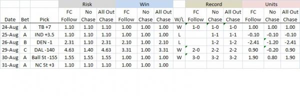 SYSTEM 1: *This follows the Football Crusher 4-game chase with modified risk: the chase will be to win previous bet and 1 additional unit (if -odds) or risk 1 additional unit (if +odds). After 4 straight losses, the chase ends.